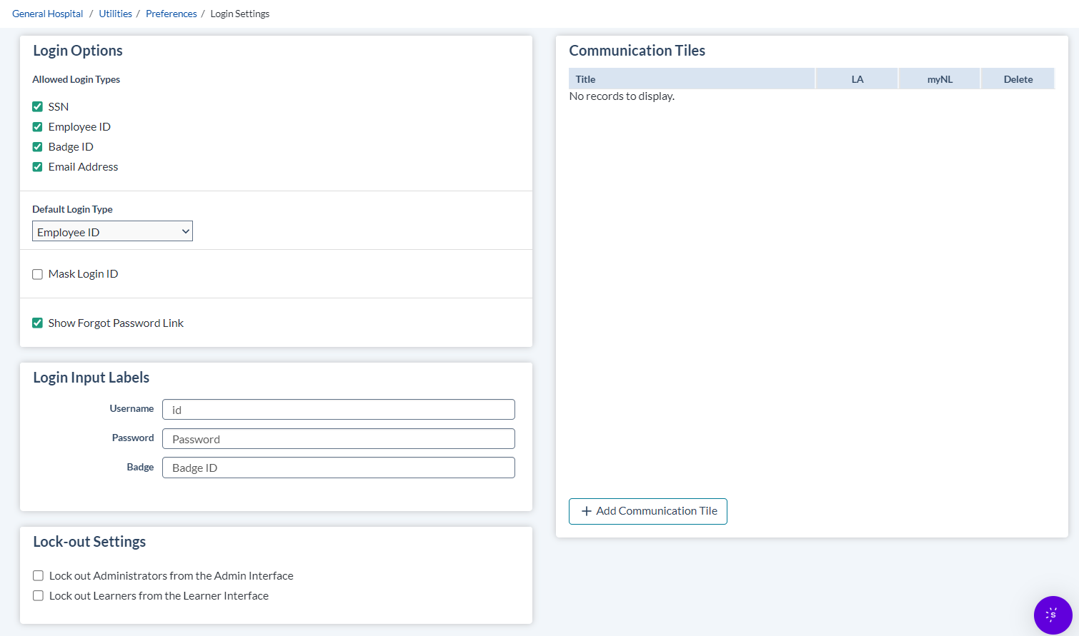 | Lock-out Settings | These options provide the ability to lock down either symplr Learning or symplr Learning in order to make system changes. |