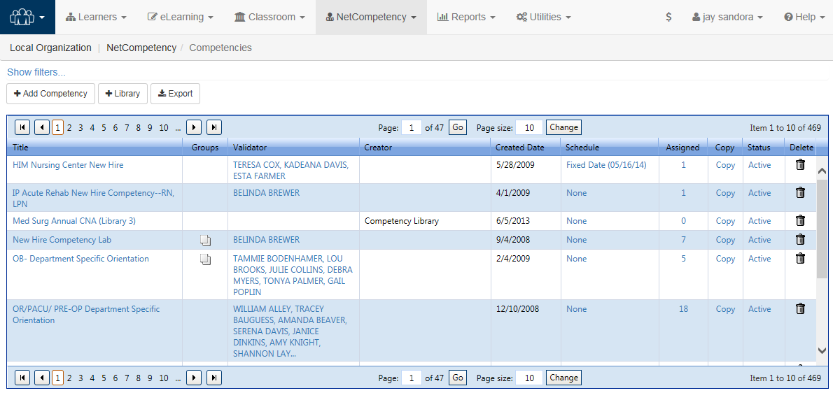 Filters above the main grid enable you to quickly find a specific competency or browse a smaller list of competencies. More assistance on using filters can be found in the navigation section of this guide.
