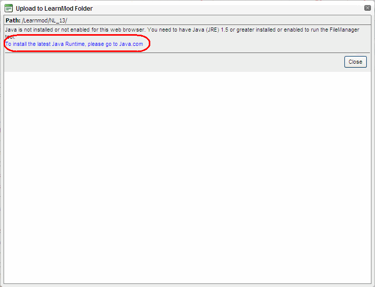 Clicking the link opens a page where you can download the Java application. Download the file and run the installation program. When the installation has completed, you can return to the Manage Content page.