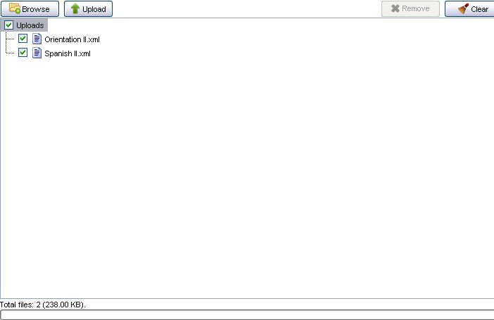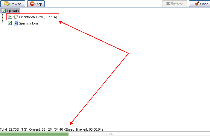 . This will initiate the upload process. You will see progress markers next to each file as it is added to the LearnMod folder. The entire upload process is measured in a status bar along the bottom of the Upload window.