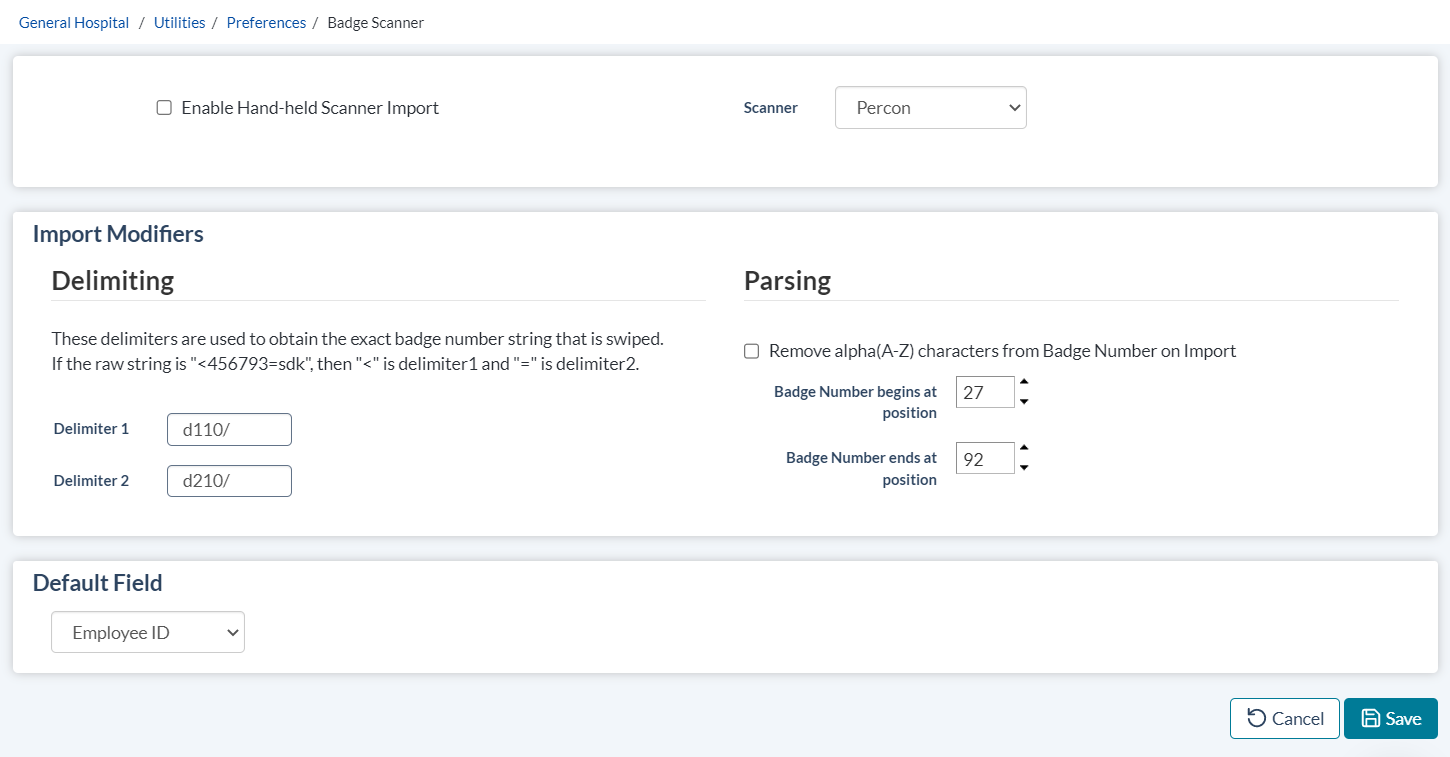 | Enable Handheld Scanner Import | Select this check box to allow records to be imported into symplr Learning Administrator from a badge scanner. |