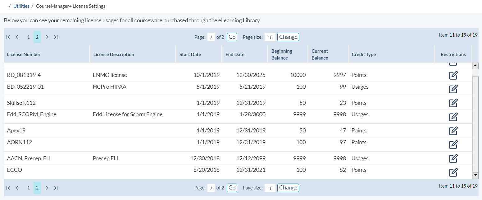 The CourseManager+ License Settings page allows you to view licensing information for any eLearning course content your organization has purchased.