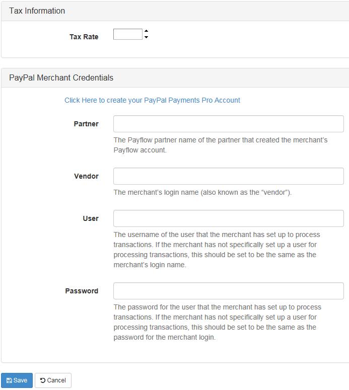 The eCommerce page allows you to configure tax rate info and PayPal account details for collecting fees for classes.
