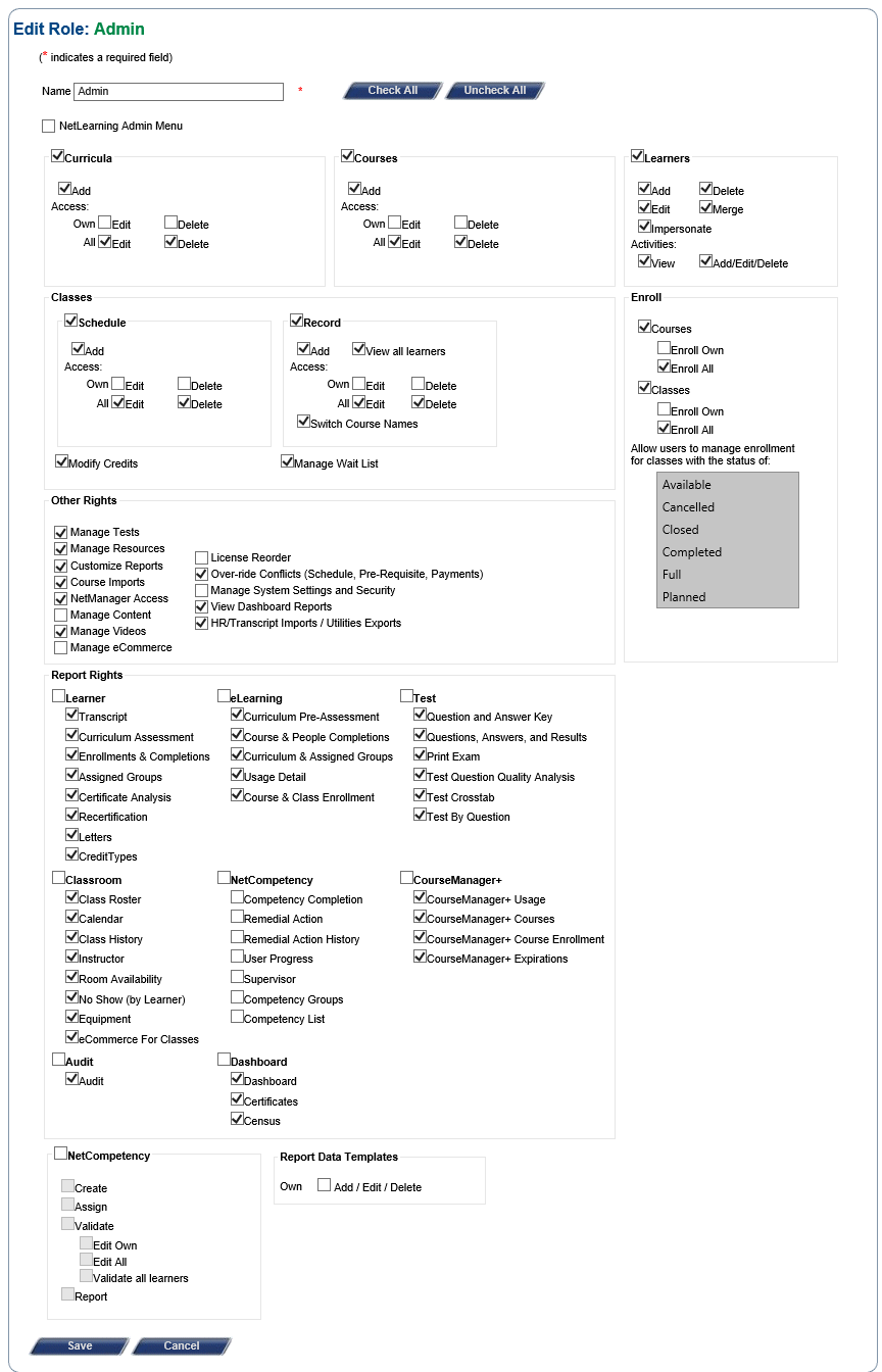 Click Manage Tests to allow the role to have administrative rights over tests. Click Manage Resources to allow the role to have administrative rights over resources. Click Customize Reports to allow the role to modify report templates. Click Course imports to allow the user to access the Course Imports area in order to modify and add course content. Click NetManager Access to allow the role administrative rights in NetManager. Click Manage Content to allow the user to access the File Manager area in order to upload and download content through the Learnmod folder. Click Over-ride Conflicts (Schedule, Pre-Requisite, Payments) to allow the role the ability to resolve issues with payments and scheduling within symplr Learning Administrator. Click Manage System Settings and Security to allow the role to have administrative access over system settings and security. Click View Dashboard Reports to allow the role to view dashboard reports. Click HR/Transcript Imports / Utilities Exports to allow the role to have administrative access to imports and exports. |
